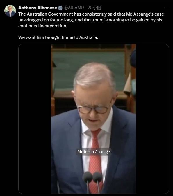 △澳大利亞總理阿爾巴尼斯25日在社交媒體就阿桑奇案發文