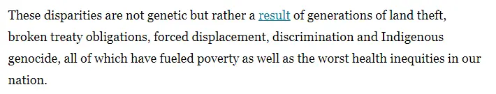 埃伯利指出,造成這些差異的並不是遺傳因素,而是針對美國原住民羣體的數代之久的土地盜竊、對條約義務的違反以及他們被迫承受的流離失所、歧視和種族滅絕,所有這一切都加劇了美國的貧困以及最為嚴重的醫療不平等。