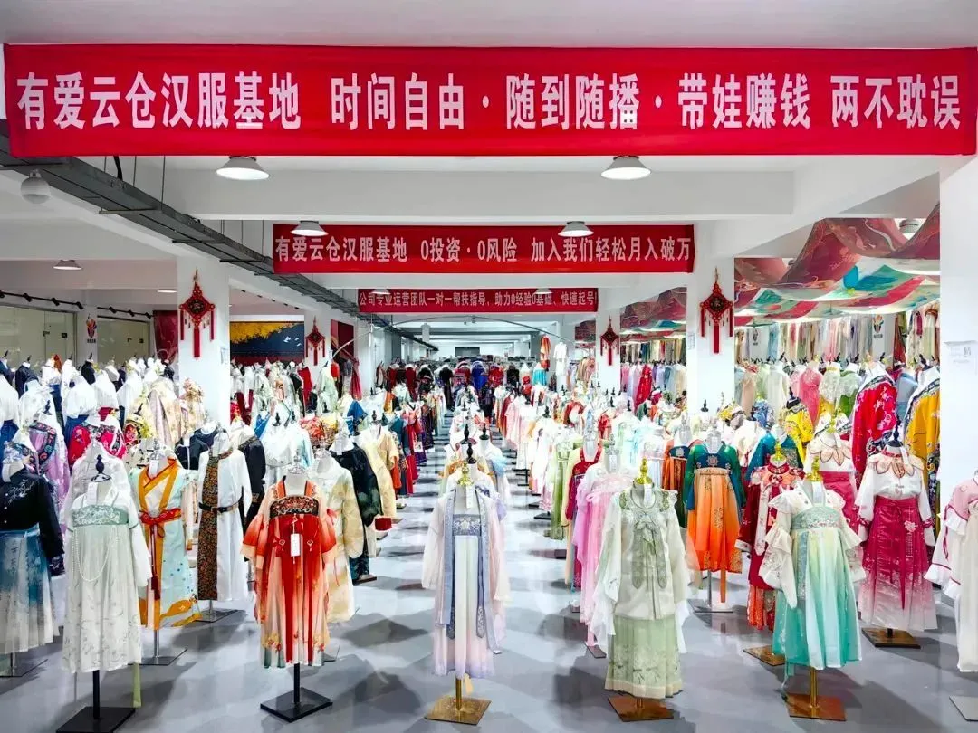 李字雷自此搭建起了有愛雲倉平台,2022年在安蔡樓鎮建起曹縣第一家漢服直播基地。“以前本地商户都關着門在家做,賣漢服、馬面裙只在線上。”安蔡樓鎮電商辦主任李賀告訴我,“我們就動員大概400家企業,把漢服放到基地,除了直播,更方便那種需要選款的大客户到現場一站式採購。”