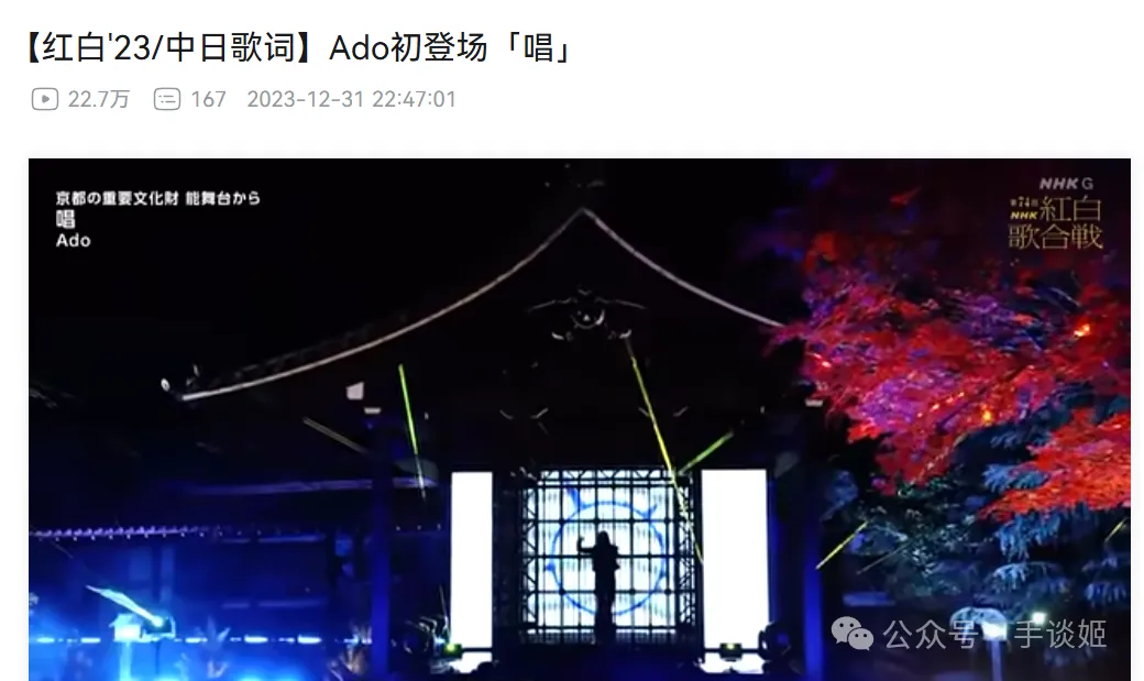 又或者是幕後團隊感受到了Ado的怨氣,於是讓她兩次登上紅白歌會,並且在2023年紅白歌會上,讓她在京都東本願寺分會場演唱了自己的新歌。