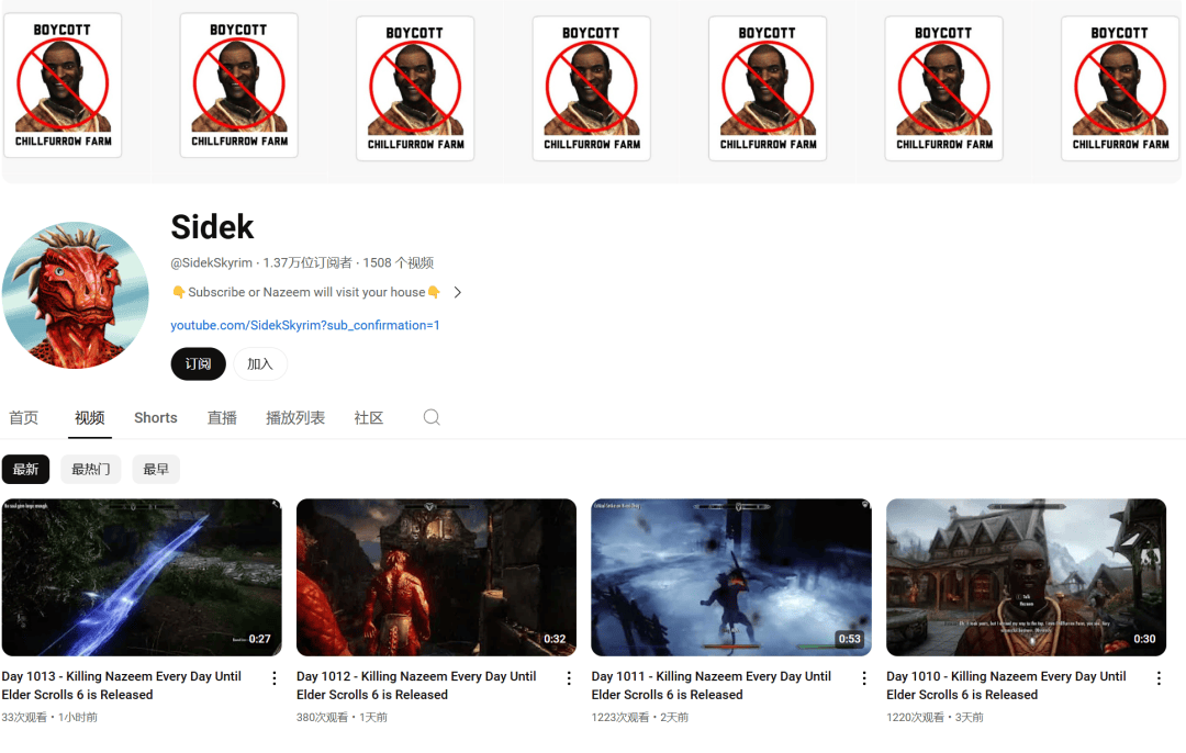 這幾天,Sidek的視頻又迴歸了以往的風格,普通地進入遊戲,普通地迫害着納齊姆,截止到目前,Sidek迫害納齊姆的視頻已經上傳了1013個。