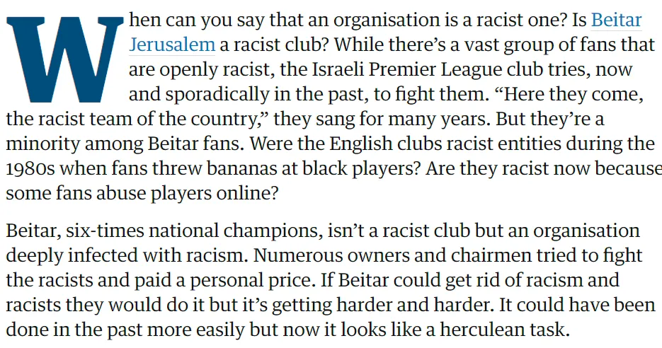 英國著名的“左翼媒體”《衞報》報道貝塔爾·耶路撒冷的“種族主義”時,強調La Familia只是貝塔爾粉絲的**“極少數”**(這話怎麼聽着有點熟悉),並類比80年代英格蘭俱樂部個別球迷向黑人球員扔香蕉不能代表俱樂部是種族主義實體,拒絕將貝塔爾隊認作種族主義俱樂部。