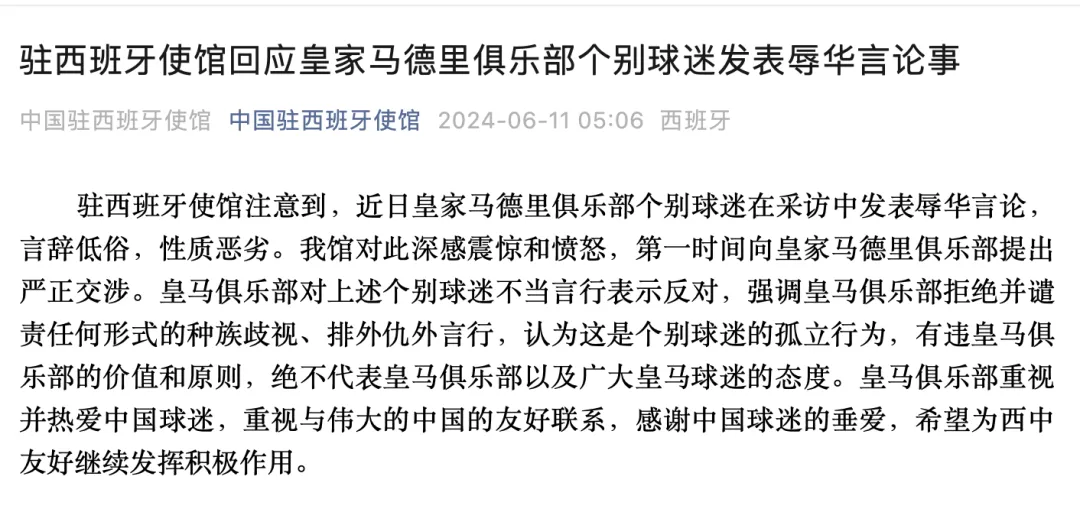 事件後來引發中國駐西使館直接向皇馬俱樂部提出嚴正交涉,根據中使館方面的表述,後者在交涉中表達了態度,但迄今尚未以俱樂部官方公告或其他正式聲明方式做出回應。
