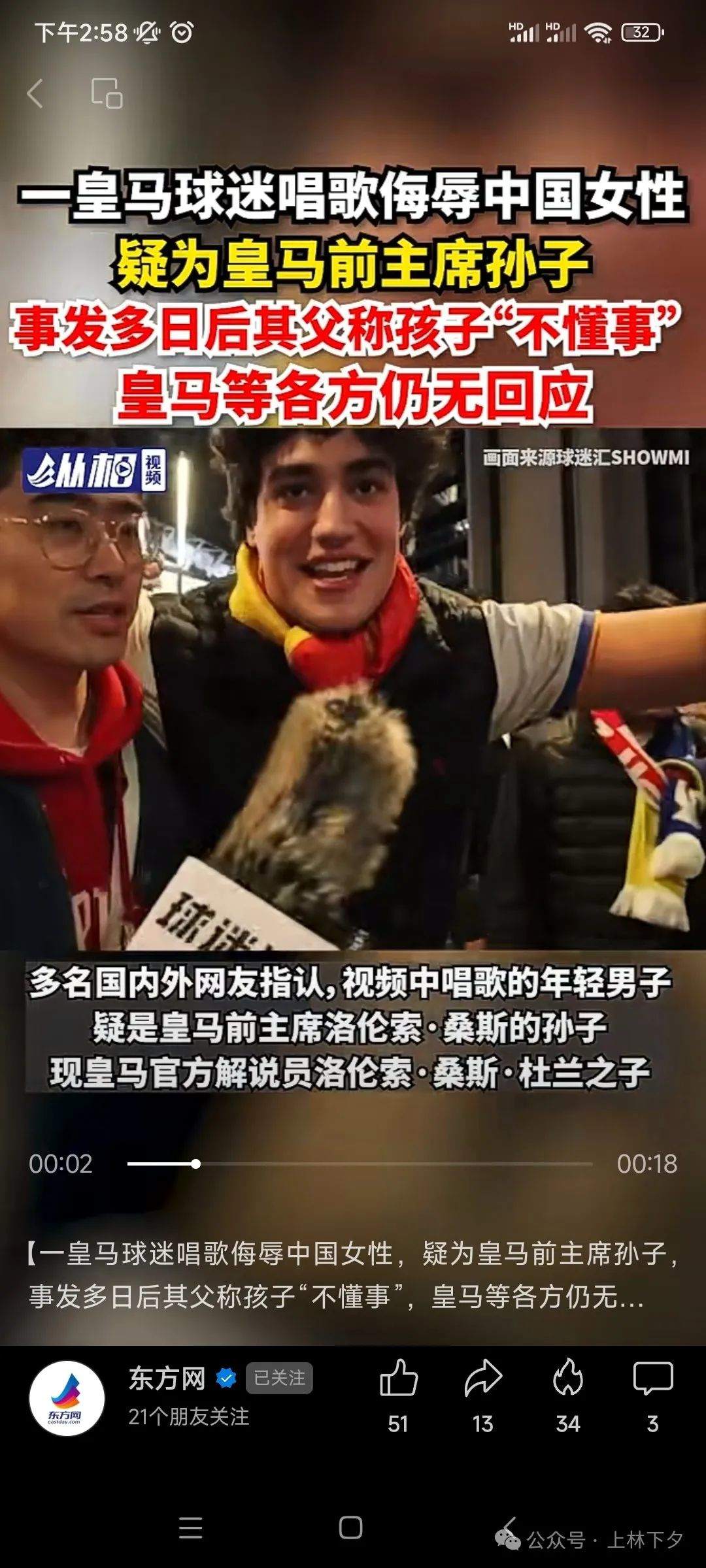 6月2日,西班牙足球豪門皇家馬德里隊在本賽季歐洲冠軍聯賽決賽中獲勝奪冠,但在決賽舉辦地英國倫敦賽後的皇馬球迷慶祝隊伍中,卻出人意料地爆發了一件公然辱華事件。