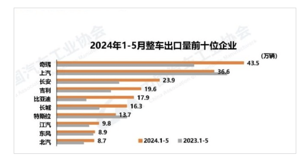 2024年前5個月,奇瑞出口量達到43.5萬輛,衞冕中國車企出口冠軍。