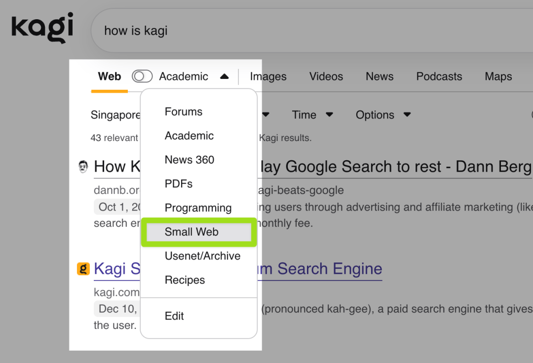和谷歌類似, Kagi 也支持你選擇搜索的範圍,比如學術、論壇、新聞,但它很巧妙地添加了 Small Web 這一類別,讓你發現那些小眾網站。