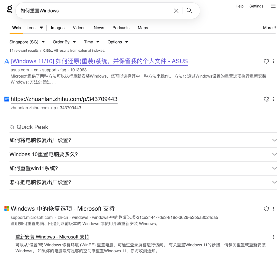 搜 “ 如何重置 Windows ” ,它給出的前三條結果分別來自 ASUS 、知乎用户回答、 Windows 官方。