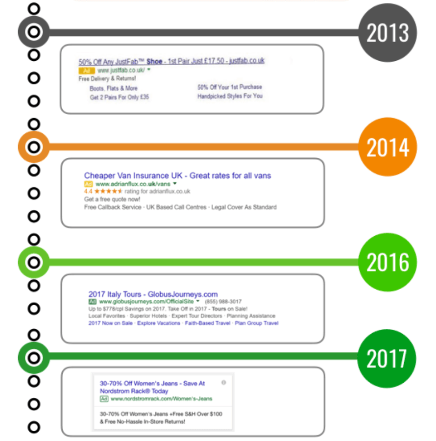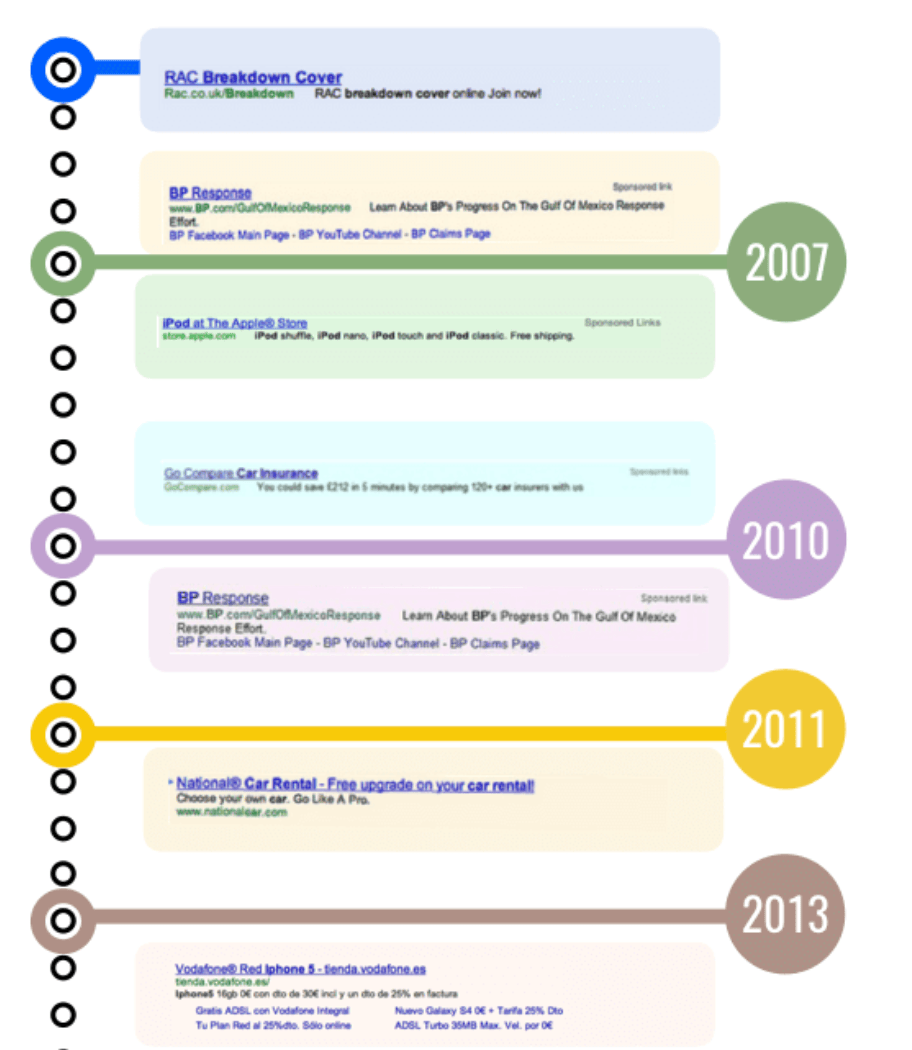 但漸漸地,廣告背景色越來越淡了。在 2013 年,谷歌乾脆取消了背景色,取而代之的是一個 “ Ad ” 的廣告標籤。