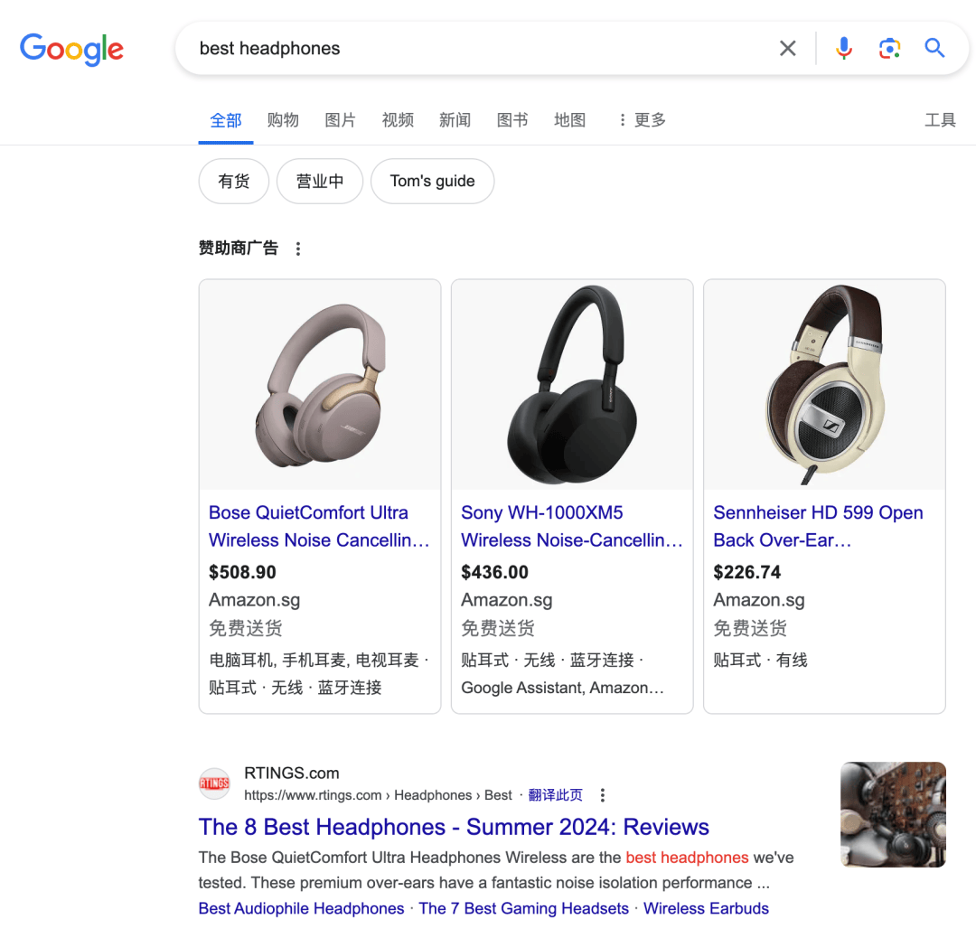 可你在谷歌裏輸入 “ best headphones ” 後,一股腦出現的是廣告主的耳機,價格和鏈接都給你標好了,點擊就能購買。