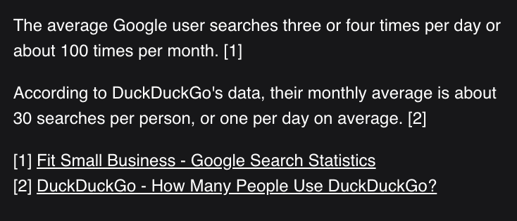 不過 Kagi 也搬來一套調查數據,説谷歌用户平均一個月也就搜索 100 次。
