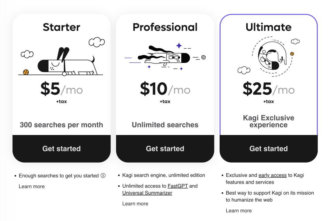 最便宜的是 5 刀 / 月,但只能搜索 300 次;中間檔是 10 刀 / 月,搜索次數沒有上限;最貴的 25 刀 / 月,可以提前享受到新功能。