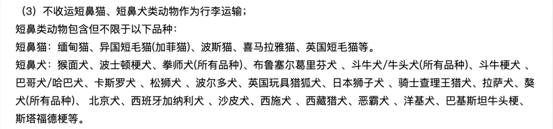 某航空公司託運寵物的一般規定中寫明瞭拒收短鼻類動物。|官網截圖