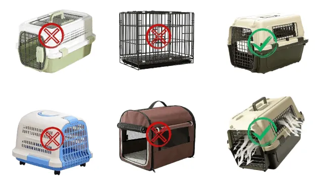 只有下圖右側的這種箱子,才是標準的航空箱。頂部沒有通氣孔,可以防止物品掉落砸傷寵物;門和箱體的左右兩側都有通氣孔,且通氣孔的材質為金屬柵欄,不能是塑料;連接處為金屬螺栓;不能是摺疊款;不能是組合或拼裝的寵物箱;底部平穩,不能有滑輪。