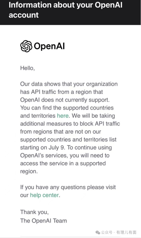 6月25日凌晨,多個用户收到OpenAI的推送郵件,信中稱,自今年7月9日起,將開始阻止來自非支持國家和地區的API(應用程序接口)服務。