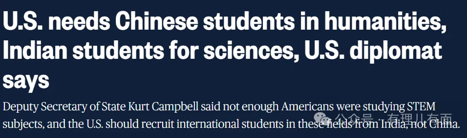 6月24日,美國副國務卿庫爾特·坎貝爾(Kurt Campbell)表示,美國需要更多中國文科生,印度理科生。