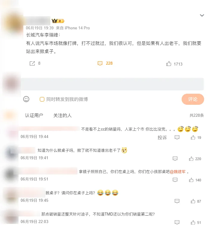 於是在6月19日舉辦的長城汽車新品發佈會上,長城汽車首席增長官(CGO)李瑞峯疑似隔空喊話比亞迪:跟不上可以喊“過”。但如果桌牌上有人“出老千”,長城就要發出預警,站出來“敲桌子”甚至“掀桌子”。