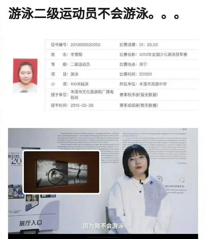 不過,仍有網友找到一篇2014年《南方週末》的報道,懷疑李雪琴在游泳二級運動員這事上造假。