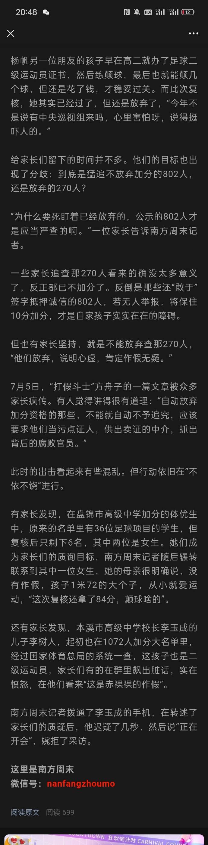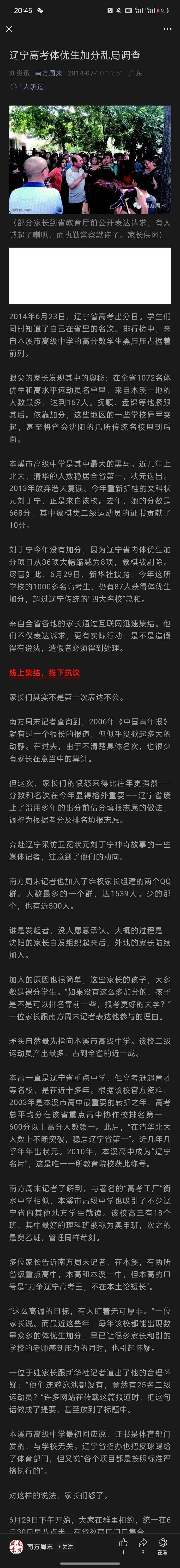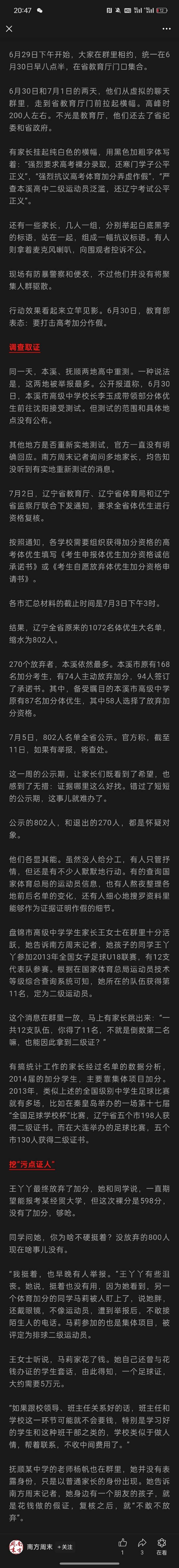 這裏網友提供了一篇《南方週末》2014年關於遼寧省體育特招爆雷的深度報道,當年這個體育特招傷害了很多學子,有關係的人花錢(七八萬)成為體育特招生就可以加分(10到20分),佔其他考生的排名,數千裸分學生家長為尋求公平共同抵至這個政策。