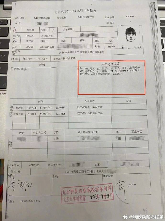 對此,李雪琴北大同班同學@稀泥巴和達撲爬 發文回應,表示她的高考成績由兩部分構成,一是高考分數633分,二是北京大學自主招生考試加分(20分),“自主招生不考察體育成績,不是體育類加分。”