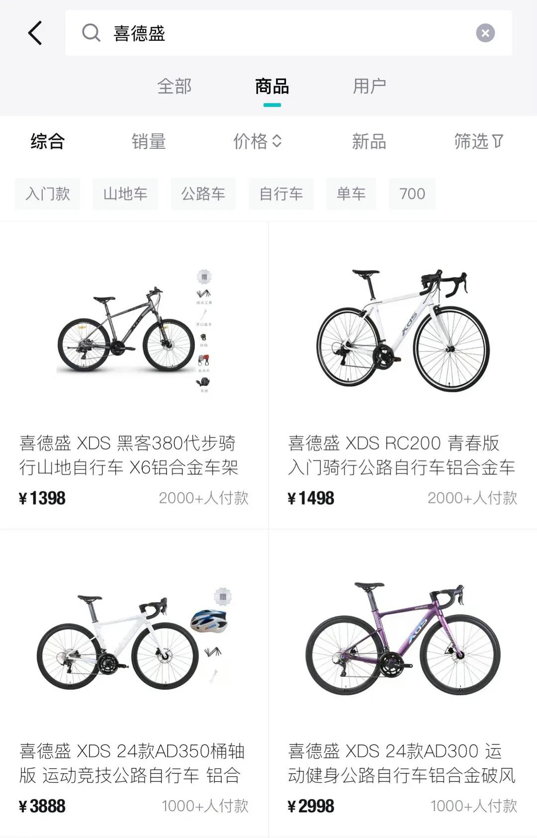 國產自行車品牌喜德盛於2023年7月入駐得物,不到一個月,日均GMV增長20倍。負責人稱,**“在得物的增速遠超其他電商平台。”**喜德盛在京東、抖音、天貓的户外騎行品類已經是銷售top1的山地車品牌,進入得物主要是將其作為拓寬市場、打開年輕用户心智的渠道。