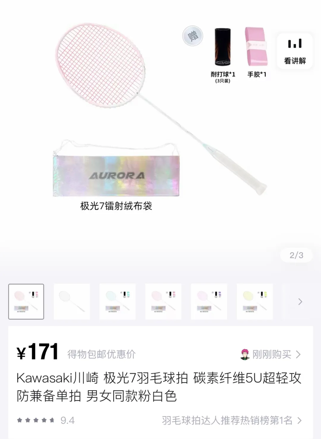 川崎的經銷商廣州健道回憶稱,剛入駐得物沒多久就爆單了,當時他沒預料到銷量能增長這麼快,有2000多單差點發不出貨,需要工廠加班加點補貨。廣州健道在發現市面上的很多羽毛球拍產品都偏老氣,不符合年輕人的審美時,針對年輕女性市場專門打造了一款顏值高、設計簡約的產品,加入了鐳射、光的元素,向品牌方提出設計的想法。