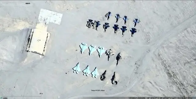 報道提到,這些照片是今年5月29日在谷歌地球中發現的,清晰地顯示了這些飛機模型遭到攻擊和摧毀的情況。在一些照片中,可以明顯看出中國空軍的訓練攻擊造成了嚴重損壞。報道稱,在這片沙漠地區建造了約 30個戰鬥機模型,表明解放軍空軍進行了集中訓練。