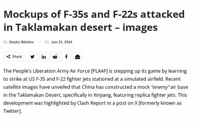 之前筆者提到西方衞星照片注意到中國在新疆塔克拉瑪干沙漠靶場對模擬美國航母的移動靶標實施了精準攻擊。事實上,讓西方震驚的還不只於此。《保加利亞軍事》網站21日稱,中國還在附近地區修建了一座模擬的空軍基地,其中停放的F-22和F-35隱形戰鬥機模型顯然已經在攻擊中受到嚴重損害。