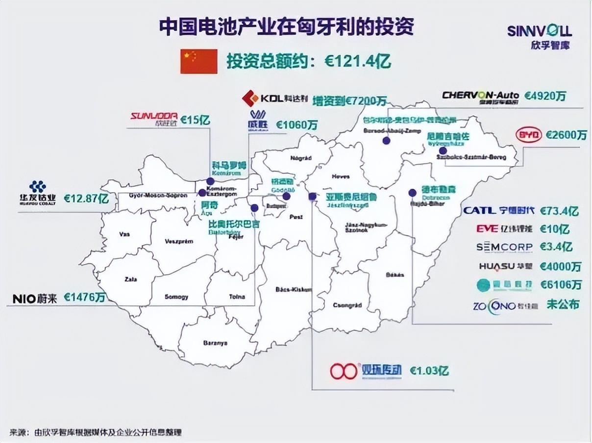 目前,中國動力電池生產商中,寧德時代、比亞迪、億緯鋰能和欣旺達等四家企業落地匈牙利。