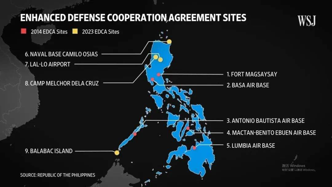 據悉,這5處菲軍事基地分別是位於呂宋島的巴薩空軍基地,通過擴建後將成為美軍在菲律賓國內最大的空軍基地;呂宋島的馬格賽賽堡軍營、棉蘭老島的倫維亞空軍基地、位於巴拉望島的包蒂斯塔空軍基地,該基地距離我國南沙羣島最近、以及麥克坦島的麥克坦-貝尼託埃本空軍基地。