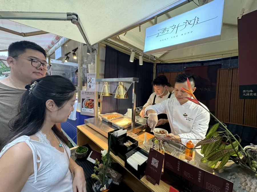“建議你來黑珍珠餐廳市集看一下,上海很多高端餐飲的主廚或負責人都在,可以現場聊聊。” 上海柏悦酒店·悦軒的主廚楊超説。記者到達市集時,同樣是雨天,卻人頭攢動,很多外國遊客也饒有興趣地打卡。