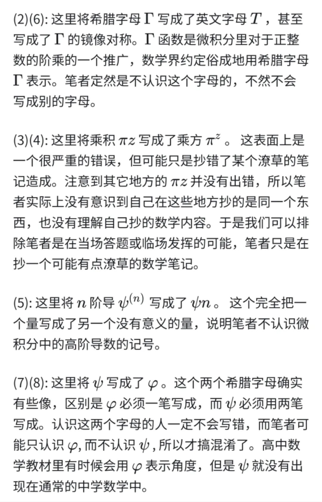 數學圈以外的人,可能會將所有這些問題解釋成緊張或書寫習慣問題。***現在我打個比方來解釋這個板書在數學世界中有多嚴重。***雖然任何比喻都會有其不精確性,但是比喻的作用來自其通俗性。假設有一個全中國俄語作文大賽的獲獎者,在黑板上抄了一段俄文。旁觀者們完全不懂俄語,都覺得這個板書頗有大家風範。後來,一個俄語專家看了這個板書,以下是這位專家的發現。他第1秒發現這個板書裏有很多單詞抄錯了,感覺可能是獲獎者緊張或疏忽所致;他第3秒發現有幾個非常常用的單詞抄錯了,這些常用的單詞如同英語裏的 the 和 is 那麼常見,他覺得即使是上過一學期俄語課的人也不會犯這種錯;他第5秒發現板書裏面有很多俄語字母寫錯了,有些俄語字母被寫成了其它的俄語字母,有些俄語字母被寫成了一些俄語中不存在的符號;他第7秒發現,有個俄語字母在板書裏出現了5次,但是卻在板書裏被寫成了3個不同的符號。他的結論是,獲獎者連俄語的字母都沒有認全。注意,這裏説的是筆者沒有認全俄語的33個字母,而不是指那幾千個常用的俄語單詞。
