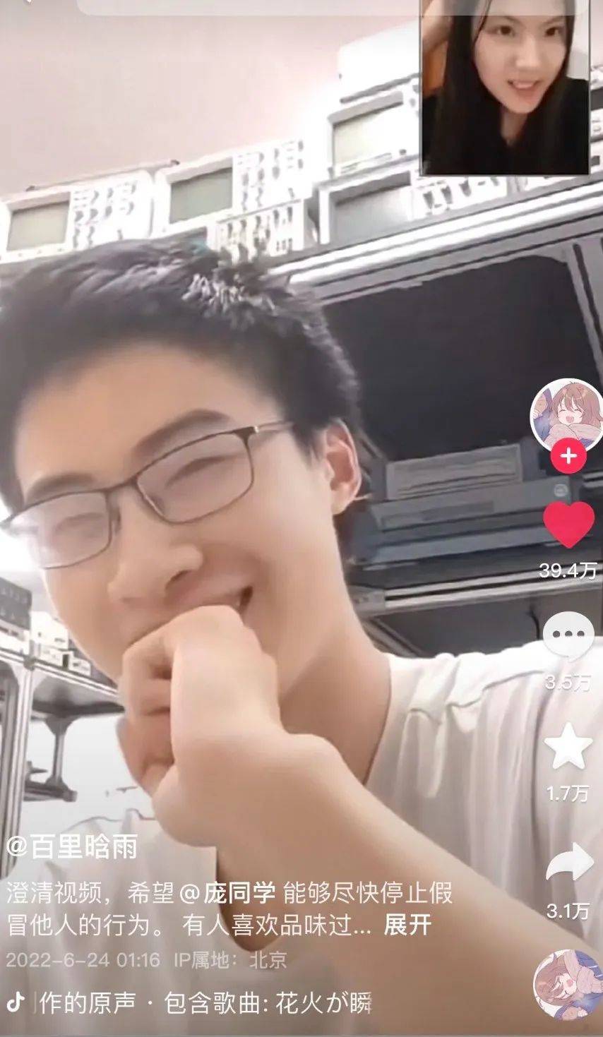 女友還替他發佈了一段公開視頻打假,視頻中,女友連線龐眾望,問他作為當事人,為何不去開設一個短視頻賬號分享自己的故事。
