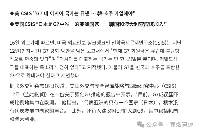 最近我在上網的時候刷到一條新聞,原始信源是韓國的保守派媒體《中央日報》,該報援引美國臭名昭著的反華智庫——美國戰略與國際研究中心(CSIS)於近期公佈的一份調研報告稱,“七國集團(G7)應該儘快擴大其朋友圈規模,將成員國增加到8個甚至是9個,最好是將韓國和澳大利亞都拉進來”,還説什麼“如果有必要的話,建議美國考慮將原G7框架內的一些個‘無足輕重’的西方國家——比如加拿大踢出去,改讓韓國來填補這個空缺。”