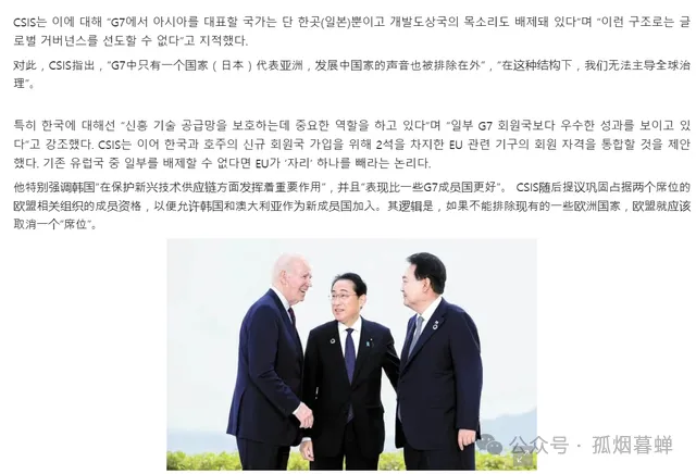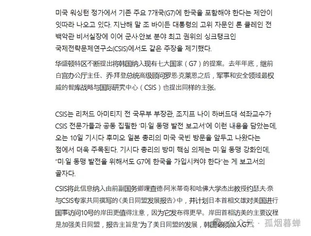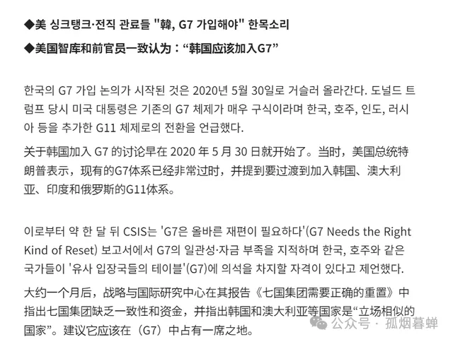 CSIS那份報告我懷疑也是,這種西方智庫的運作模式懂得懂的,什麼狗屁智庫,出謀劃策都是虛的,它們存在的最大價值就是作為某些利益集團的嘴皮子為人家發聲。人家是射箭的,它們是畫靶子的。韓國想要入G7,那CSIS就想方設法圍繞着這麼個話題弄個像模像樣的報告出來,讓整個流程實現閉環了就行。