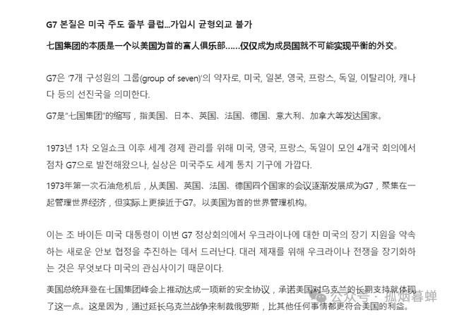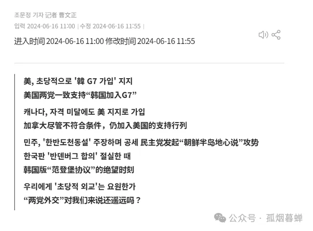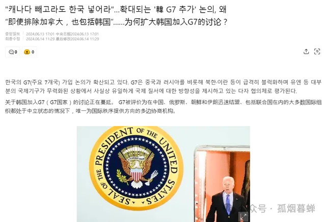 誒,我這麼説可不完全是主觀推斷啊,有依據的。《中央日報》的原文裏頭其實也提到了,在相關報道登出之後,韓國外交界人士在當天就站出來發表了積極看法,説什麼“韓國加入G7成為G8國家,意味着韓國從遵守發達國家規則的‘規則接受者’,轉變成為了可以自己制定規則的‘規則制定者’。為了我們韓國自身的利益,我們應當積極支持G7擴大成員國圈子。”