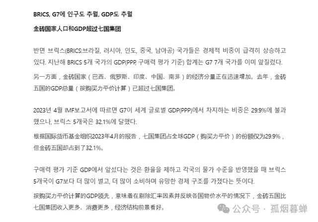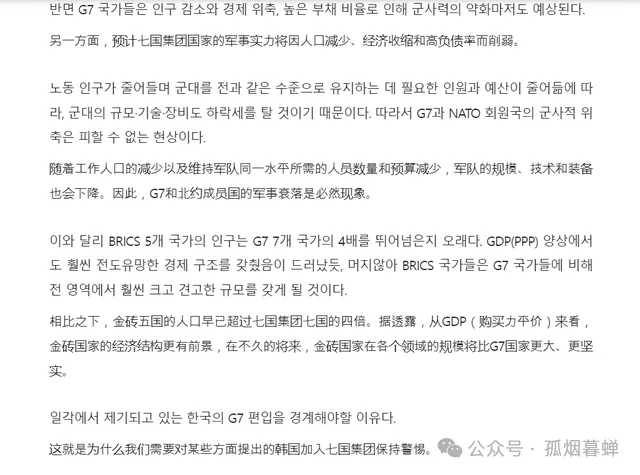 “而另一方面,反觀由中國等國構成的金磚國家組織,人家在世界經濟版圖中的分量卻是與日俱增。按平價購買力計算,現在金磚五國的購買力已經超越G7了。論人口規模,金磚更是G7的4倍。無論從哪個方面來看,和G7相比,金磚的結構都更合理,經濟上也更具潛力。在不久的將來,金磚國家在各個領域所取得的成就,還將比G7的更大。醒一醒吧,G7和北約的衰落已是必然了,我們還有選擇未來的機會。不要着了那些一味鼓吹韓國必須加入G7的人的道,我們韓國國民必須打起十二分精神,對相關言論保持警惕。”