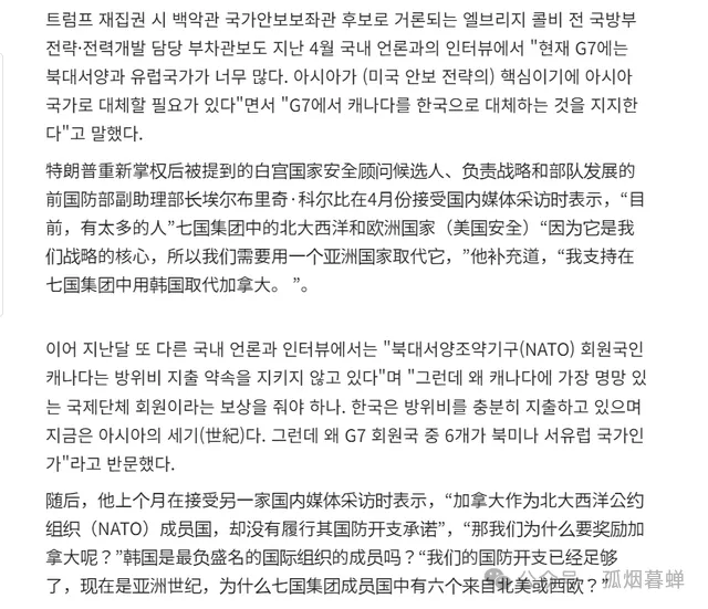 我不知道大家都是如何看待韓國人的這篇東西的,但是我看到這裏心裏頭其實就已經琢磨明白了:什麼“美國為了拉攏韓國進入G7不惜踢掉加拿大”,我懷疑這不過就是韓國那邊買通了一些個華盛頓的過氣政客,讓他説給韓國人聽的吉祥話而已。
