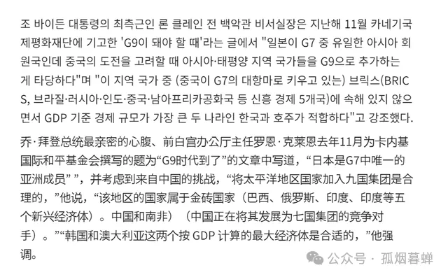 但是,但是,但是,重要的話説三遍,需要特別指出的是,我在這裏提到的所有這些説法,都不過是韓國人的一家之言——更準確點説,是親尹錫悦一夥的韓國保守派媒體的一家之言。《中央日報》給出來的這些説法,無論是美國智庫的報告也好,還是美國政客的諫言也罷,這些東西説穿了其實都是捕風捉影而已。美國政府從來沒有在任何公開場合提出過“我支持韓國加入G7”這類説法,為數不多提到的幾次還都是給韓國人潑冷水的。