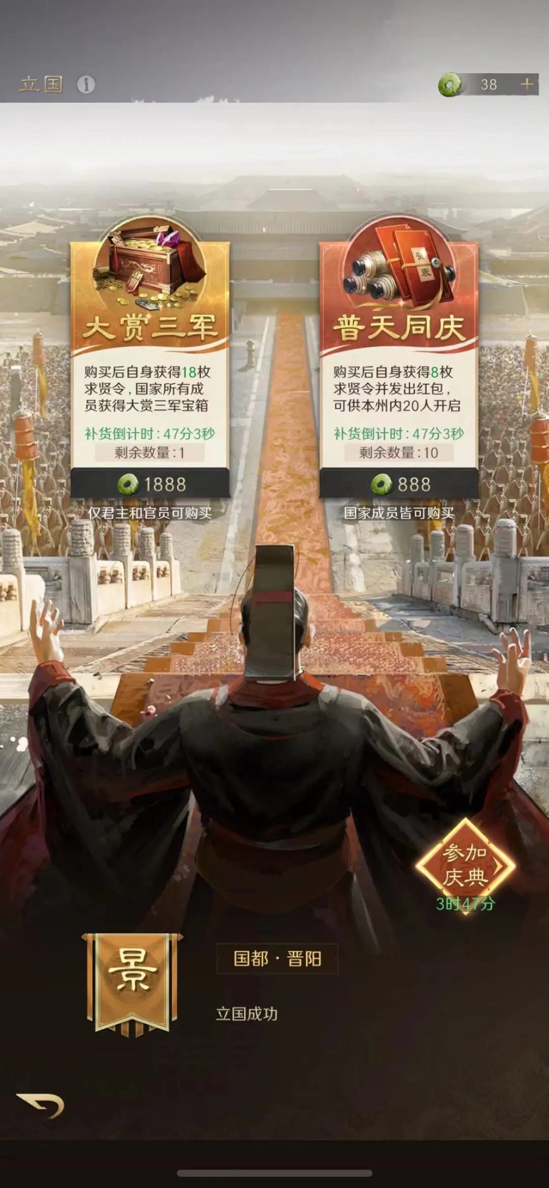 在拿下國都晉陽後,大貓盟主搶到了“大賞三軍”令,花費188元購買後自己可以獲得18枚求賢令,還可以給國家所有成員發放寶箱,一般在SLG遊戲裏,這屬於給成員發放的超值獎勵,大多由們盟主或者盟內高管負責出資購買。