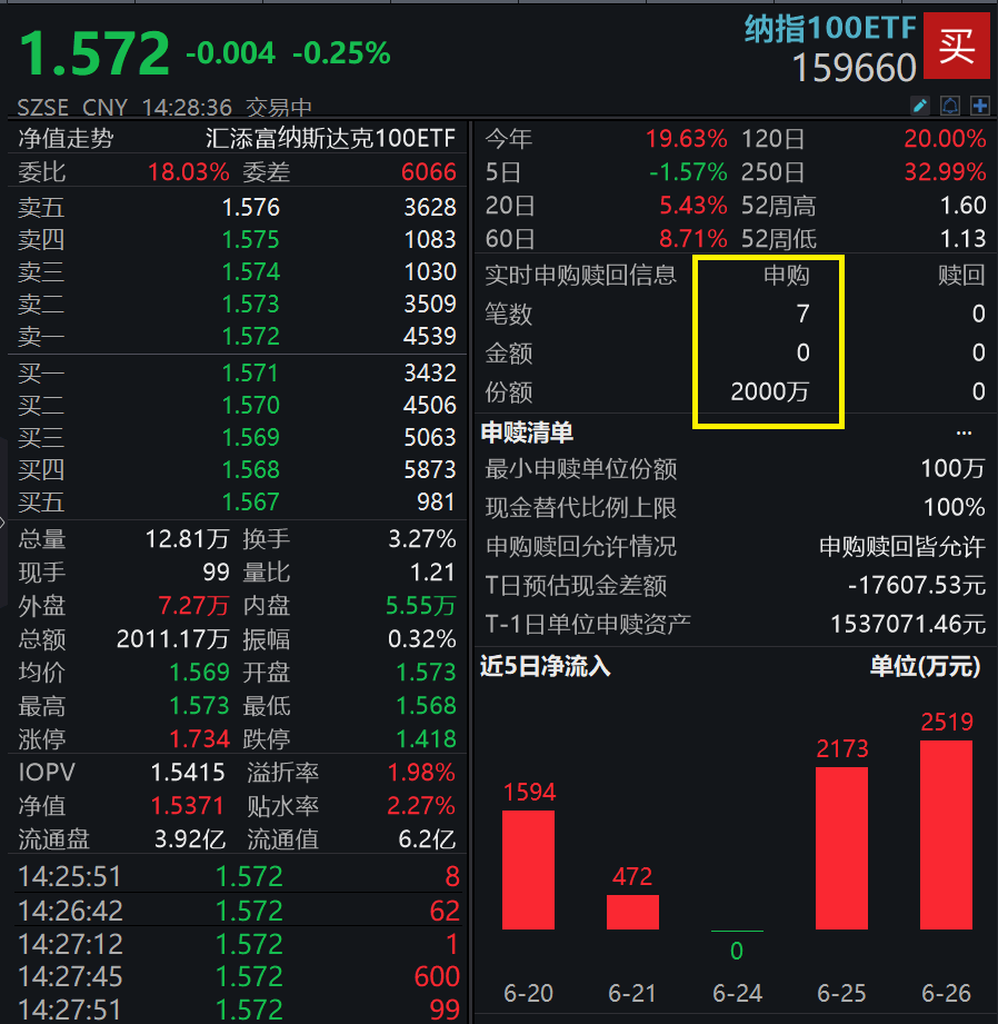 納指100對應的ETF方面,低費率的納指100ETF(159660) 今日微調,最新溢價率近2%,盤中成交額超2000萬元,資金今日再度逢跌大舉淨申購超2000萬份,至此已經連續3日吸金,合計金額高達7800萬元!