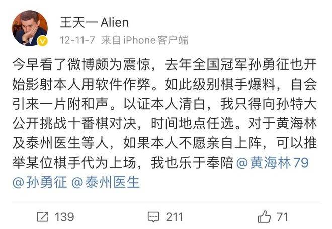 全國冠軍孫勇徵發表暗示棋手作弊的言論,王天一在個人實名制認證的微博上“約戰”
