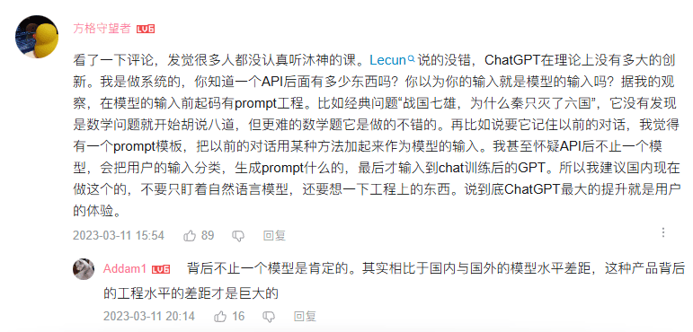 在李沐的評論區裏,不乏有用户進行專業性極強的探討。比如有人提問:現在幾乎所有大語言模型的底層架構都是transformer。它的能力會有極限嗎?(就像摩爾定律那樣)真正的通用人工智能是否還需要等到下一個超越transformer的基礎架構出現呢?這些問題下,除了李沐老師本人的解答,甚至還有用户客串“助教”。如果有不同觀點出現,觀眾之間也會爆發專業的討論。
