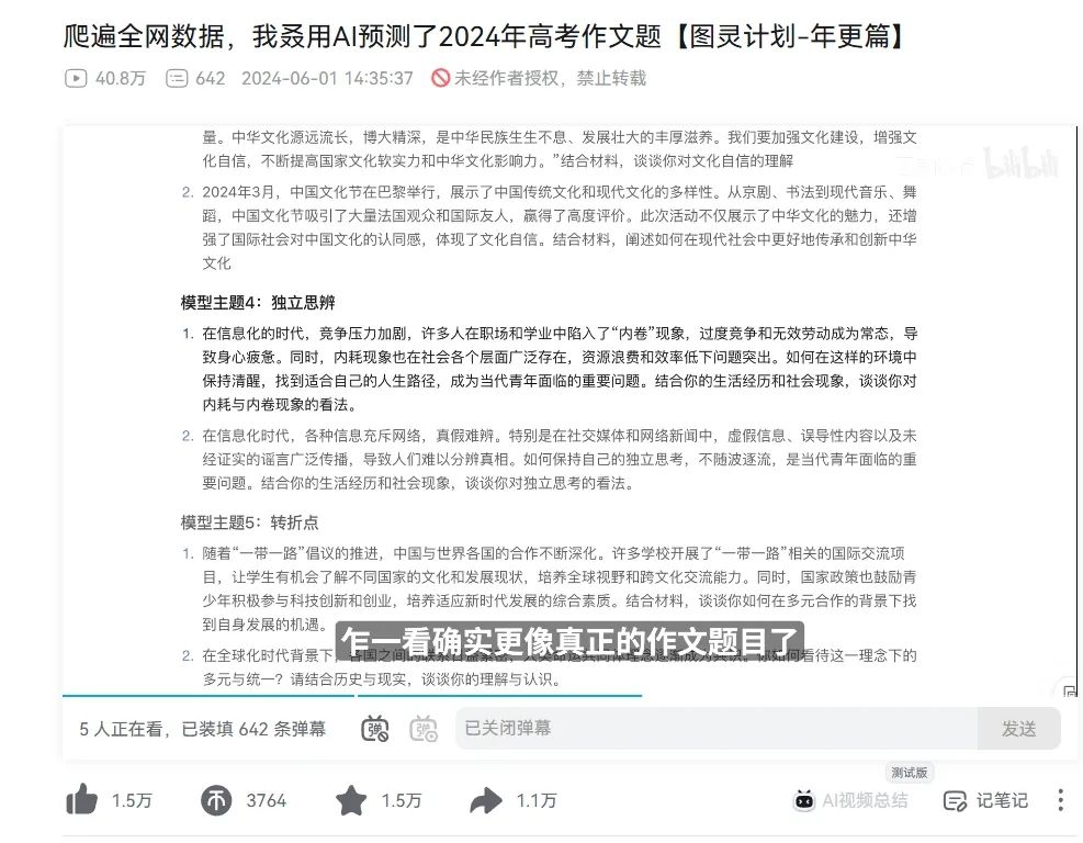 腦洞大開的UP主們,把AI訓成了最好用的工具人,從音樂、短片到鬼畜,到處有“勤勉”的AI創作者。不少AI作品流量極高,比如《天問》《宇宙牧場》等科幻短片,用AI製作的名人歌手音樂、用AI預測高考試題、用AI分析華語樂壇爆款等視頻,都在站內引發了不小的討論。