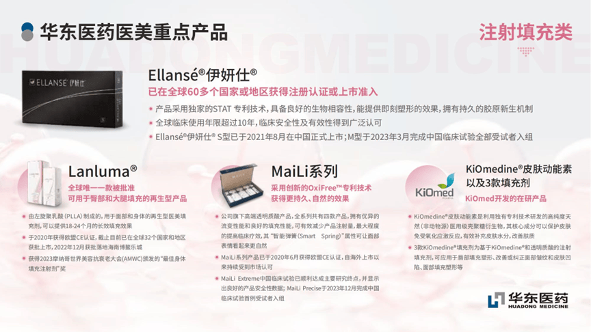 Ellansé伊妍仕作為華東醫藥子公司Sinclair的核心產品之一,因出色的“即時填充+長效維持+自然代謝”三重效果被冠以“少女針”的稱號。Ellansé伊妍仕®共有S、M、L、E四個型號,可分別提供1到4年的長效填充效果。Ellansé伊妍仕®S型已在國內上市,是國內首款獲批的三類醫療器械認證的進口PCL高端面部填充劑,新增“額部填充”適應症於2024年5月6日完成中國臨牀試驗首例受試者入組;Ellansé伊妍仕®M型已於2023年3月完成中國臨牀試驗全部受試者入組,目前正在進行隨訪。