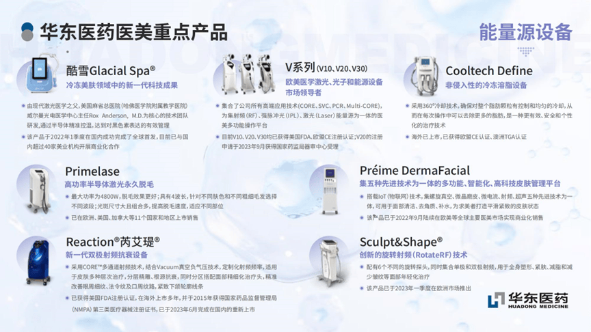 據瞭解,除了華東醫藥的減重藥物之外,其醫美手段減重涉及的項目佈局也較為廣泛。能量源溶脂醫美項目潛力巨大,更受求美者和醫生的喜愛,未來市場空間更大。值得一提的是,華東醫藥在醫美產品,尤其是能量源減脂領域已經佈局了豐富的產品。2021年,華東醫藥收購國際能量源醫美器械公司High Tech,High Tech創建了適用於診所和medi-spas醫療美容中心的創新非侵入性激光和冷凍減脂的設備組合,包括低温減脂產品Cooltech、CooltechDefine和Crystile等。