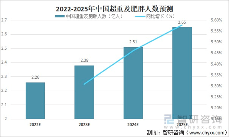 眾所周知,體重管理較差會帶來生理上諸多疾病,肥胖就是較差體重管理帶來的一種慢性、複發性和進行性疾病。自1975年以來,全球肥胖患病率持續增加。近幾十年來,中國的肥胖患病率也在迅速上升。《2023版中國肥胖地圖》表明,我國總體超重人羣佔比34.8%,肥胖人羣佔比14.1%。根據智研諮詢數據,預計2025年中國超重及肥胖人數將突破2.65億人。我國已經成為世界上超重和肥胖人數最多的國家。