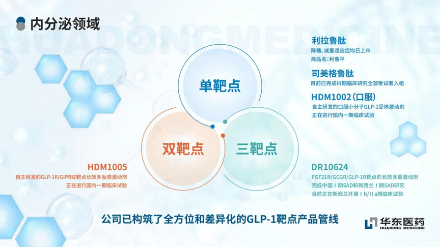 此外,圍繞GLP-1 靶點,華東醫藥已構築了包括口服、注射劑在內的長效及多靶點全球創新藥和生物類似藥相結合的全方位產品組合,包括利拉魯肽、司美格魯肽、HDM1002、HDM1005、DR10624等。