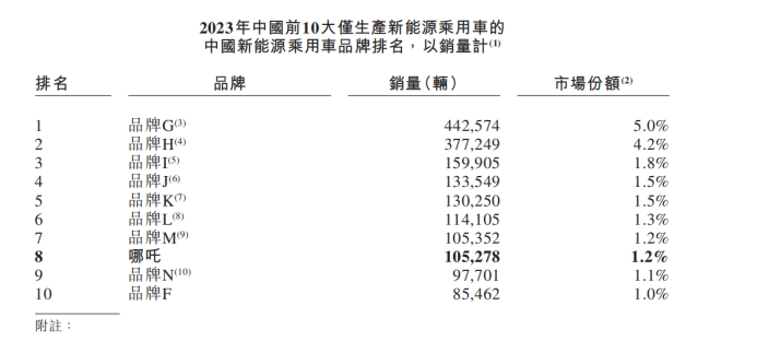比如,哪吒在招股書盤點中國新能源乘用車市場整體競爭格局的時候,引用了“2023年中國前10大僅生產新能源乘用車的中國新能源乘用車品牌”的銷量口徑進行排名。