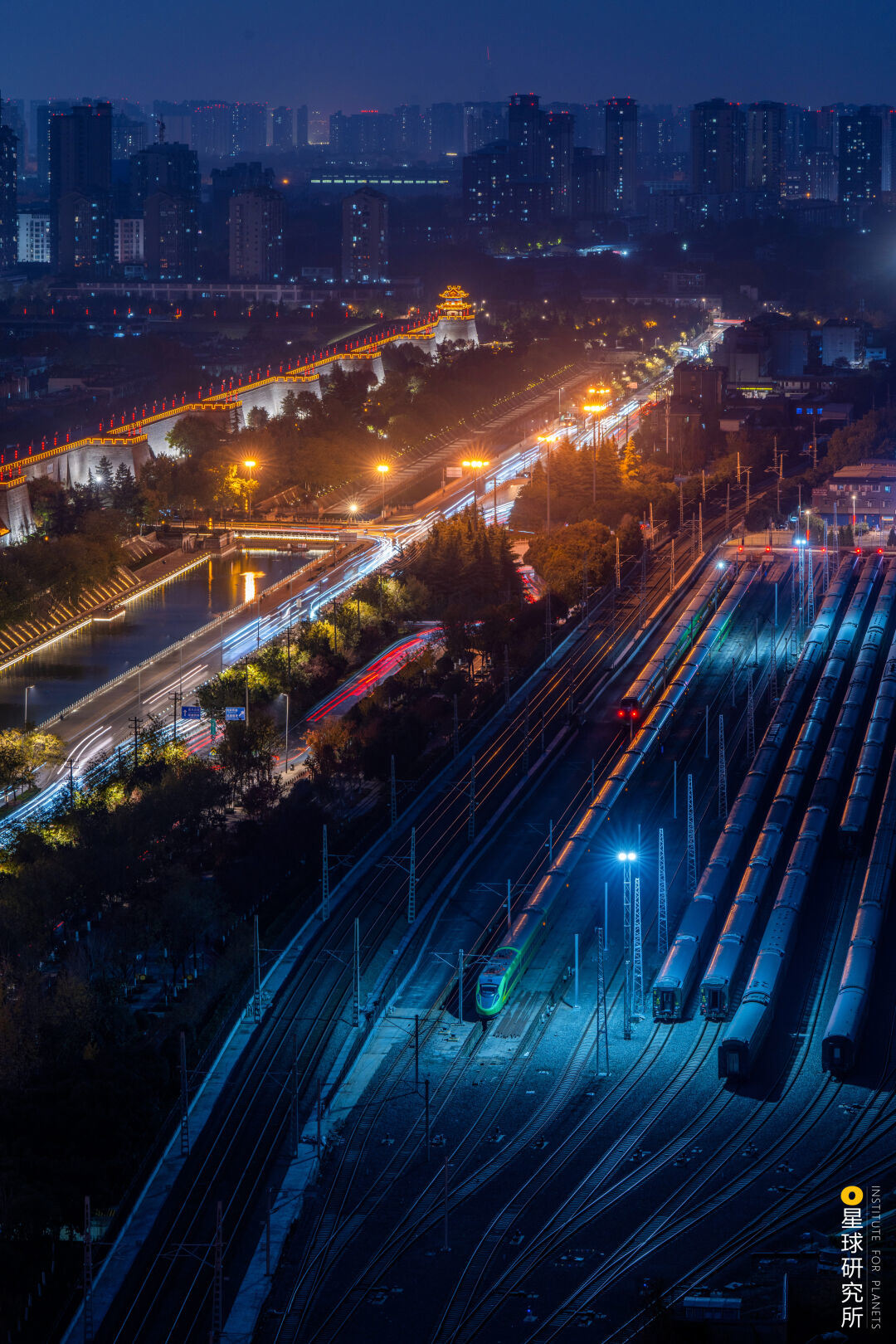 (古老的西安城牆下是一列列整裝待發的火車,從前的車馬如今變為了呼嘯的列車,攝影師@許健雄)