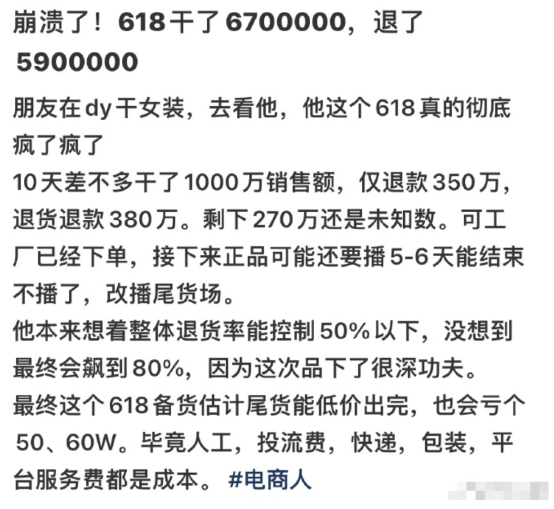 更有女裝商家表示,今年618的退貨率高達80%,到頭來簡直白忙一場。